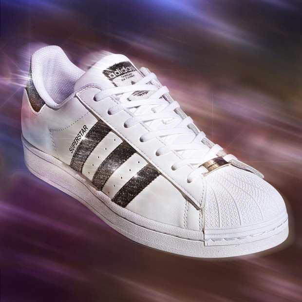 Para complementar la colección, la silueta Superstar es presentada en blanco y negro, incluyendo los detalles de cristales Swarovski en las mismas zonas que los modelos anteriores y transmitiendo una elegancia única.