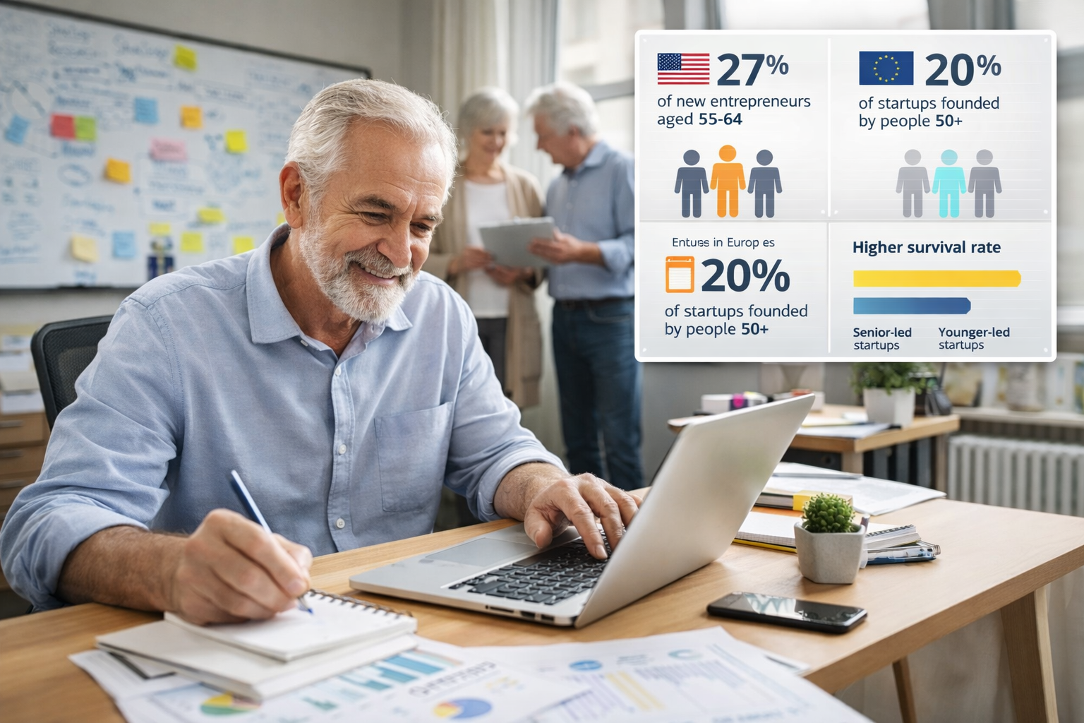 En términos concretos, el emprendimiento sénior está creciendo de forma sostenida. En Estados Unidos, aproximadamente el 27% de los nuevos emprendedores tiene entre 55 y 64 años, según datos del Global Entrepreneurship Monitor. Además, este grupo ha sido el de mayor crecimiento en creación de empresas durante la última década. En Europa, el porcentaje de startups fundadas por personas mayores de 50 años se sitúa en torno al 20% en muchos países, con incrementos constantes año tras año.