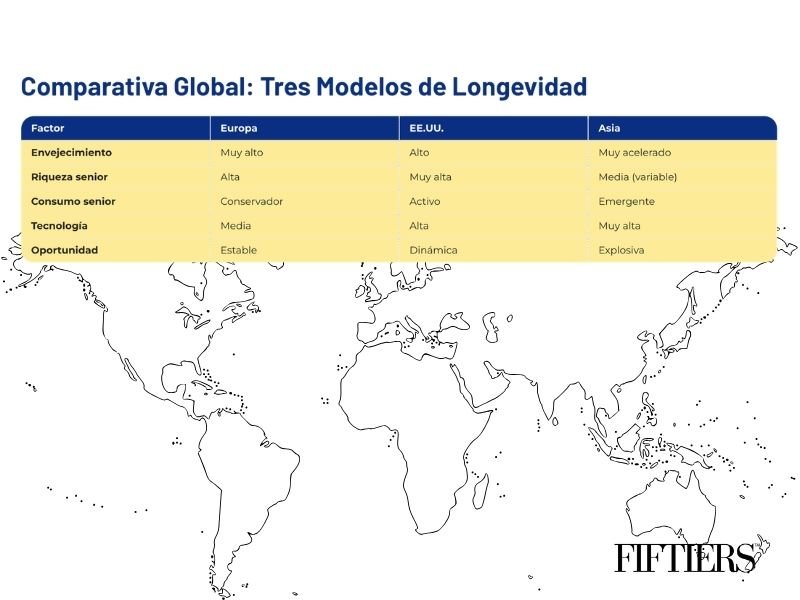 Europa, Estados Unidos y Asia no representan únicamente tres grandes regiones del mundo. Representan tres modelos distintos de envejecimiento, tres formas de consumir en edades avanzadas y, sobre todo, tres oportunidades de negocio radicalmente diferentes. Entender estas diferencias no es una cuestión académica. Es una ventaja competitiva.