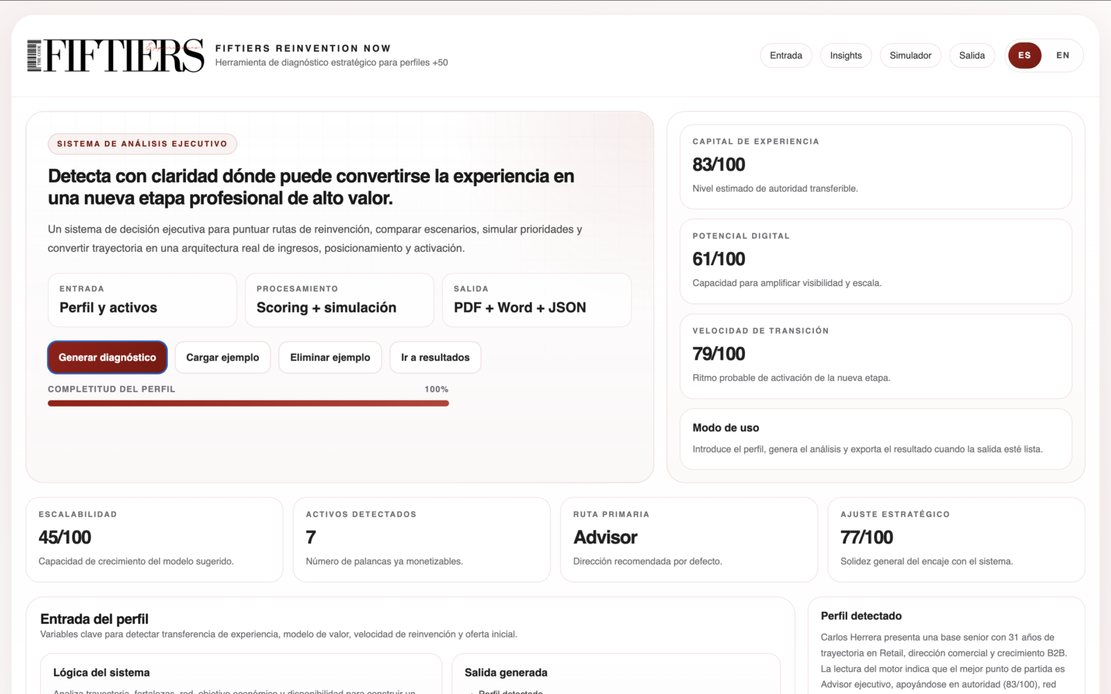 “Reinvention Now” no es un simple test o cuestionario. Se trata de un motor de análisis ejecutivo que combina variables clave como trayectoria profesional, red de contactos, nivel digital, objetivos económicos y disponibilidad, para generar un diagnóstico completo y accionable.