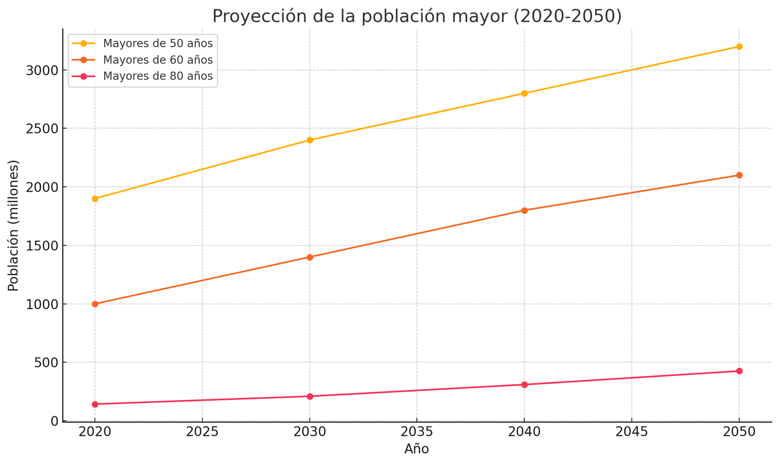 | Población mundial ≥50 años | 1.900 millones de personas | 3.200 millones de personas |