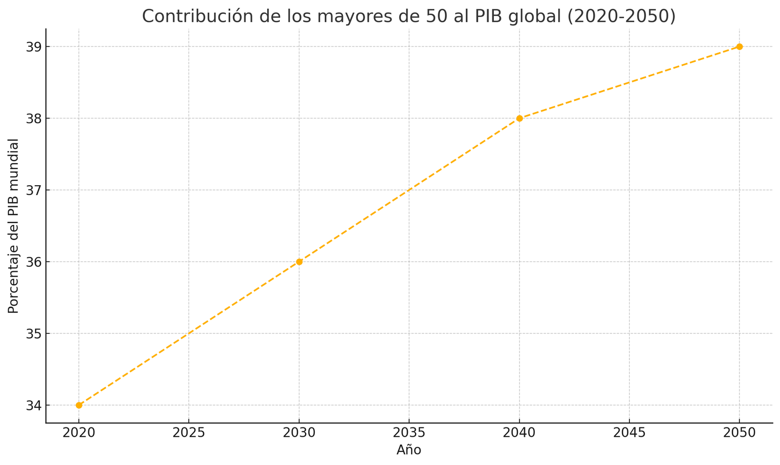 Los mayores de 50 años no solo son beneficiarios de pensiones o asistencias; también contribuyen sustancialmente a la economía global. De acuerdo con un informe de AARP y Economist Impact, en **2020 las personas de 50 años o más aportaron alrededor de $45 billones de dólares al Producto Interno Bruto (PIB) mundial, lo que equivale al 34% del PIB global, pese a representar solo el 24% de la población. Este fenómeno, denominado la “economía de la longevidad” (longevity economy), refleja el poder económico de este grupo etario. Se proyecta que para 2050 el aporte económico de los 50+ alcance $118 billones (39% del PIB mundial), conforme este segmento poblacional crezca en tamaño relativo y mantenga su actividad económica.