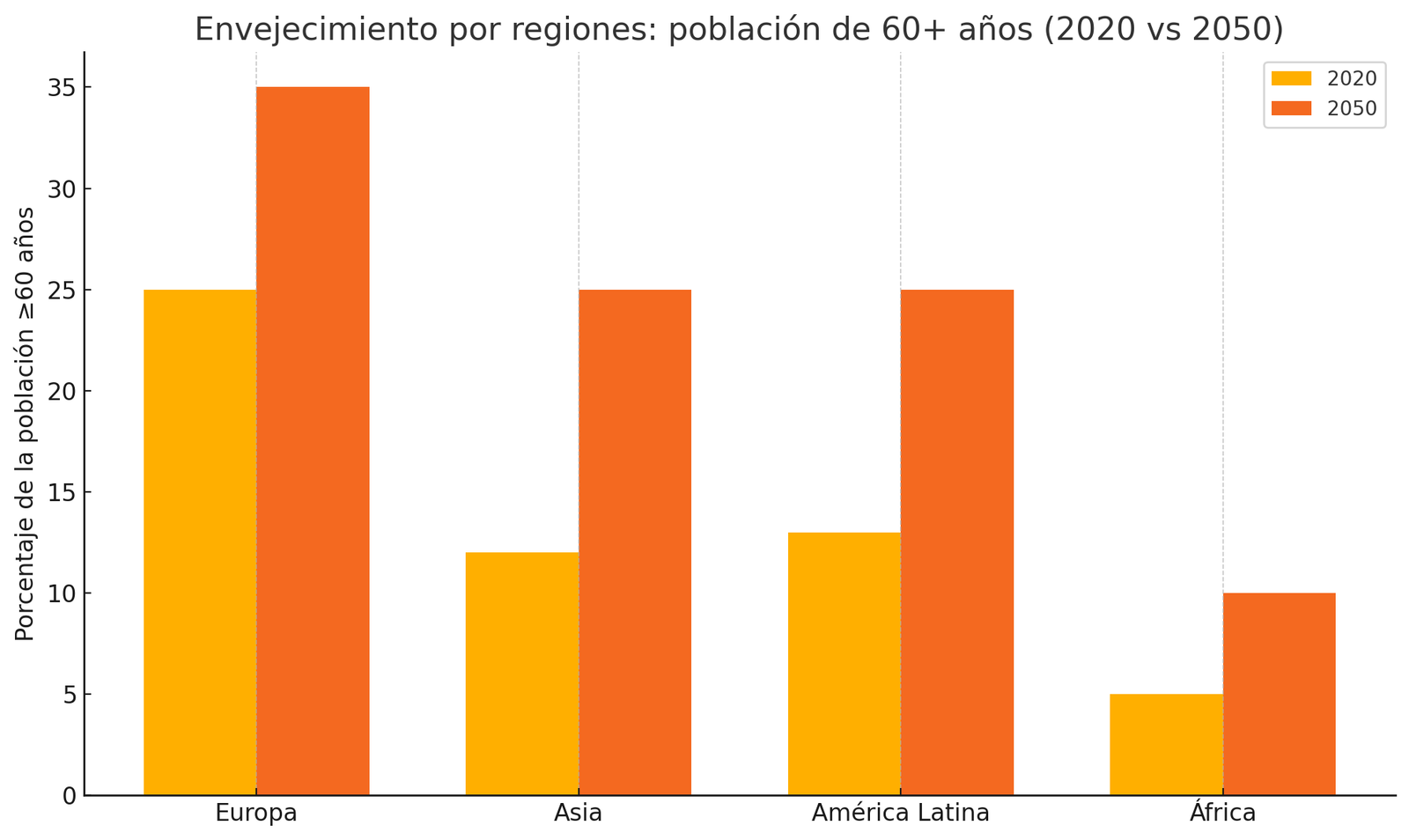 Según proyecciones de la ONU, hacia 2050 prácticamente todas las regiones del mundo (exceptuando África) tendrán un cuarto de su población con 60 años o más. En África, aunque la proporción será menor, también aumentará (se espera que el porcentaje de 60+ en ese continente aproximadamente se duplique, rondando el 9-10% para 2050). En cambio, Europa podría acercarse o incluso superar un 35% de mayores de 60, y Asia y América Latina alrededor de 25% cada una para mediados de siglo, reflejando un envejecimiento convergente. Este cambio demográfico universal implica que para 2050 habrá cerca de 3.200 millones de personas de 50+ en el planeta (frente a 1.900 millones en 2020), lo que equivaldrá aproximadamente a un tercio de la población mundial (en comparación con menos de una cuarta parte actualmente).
