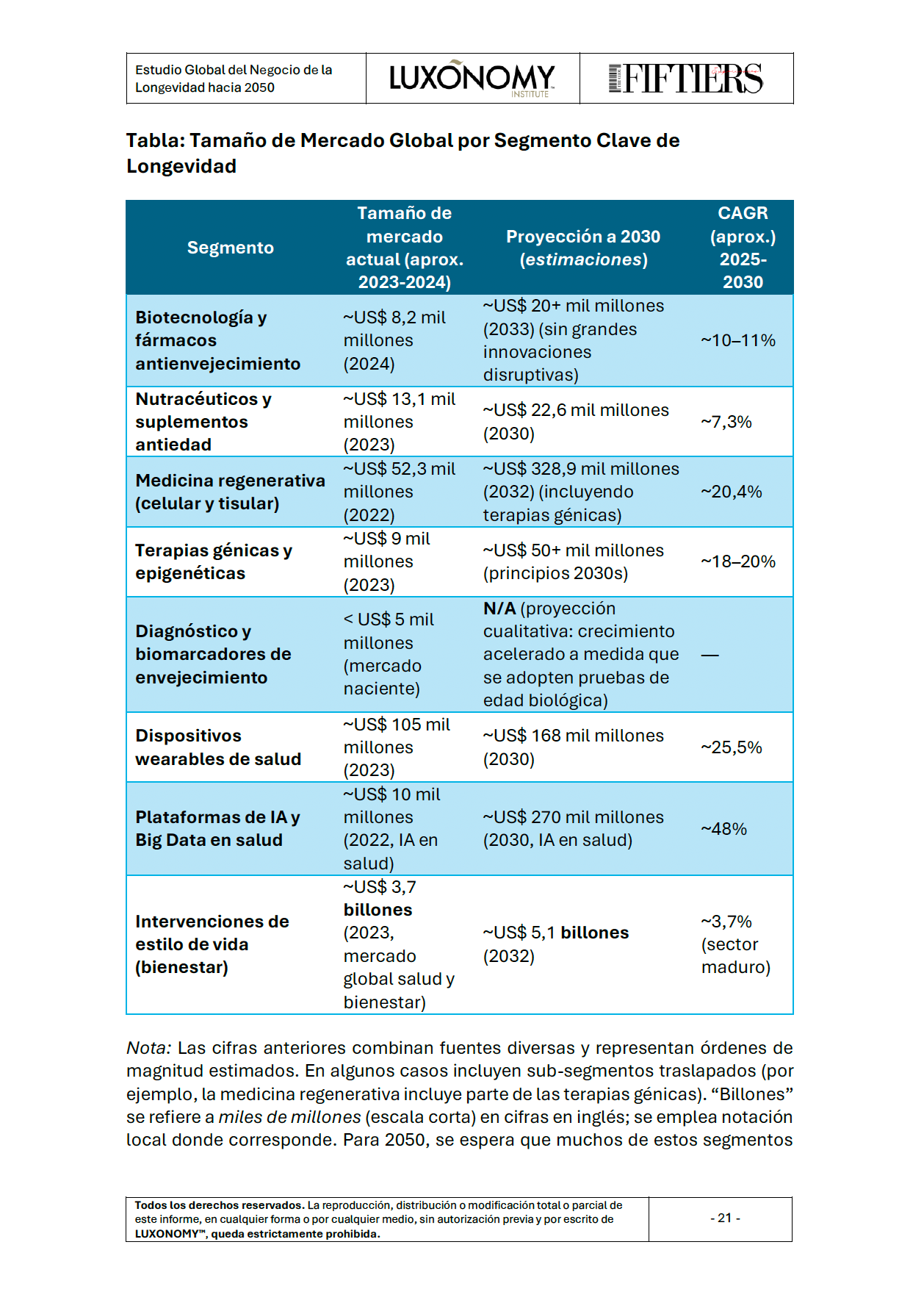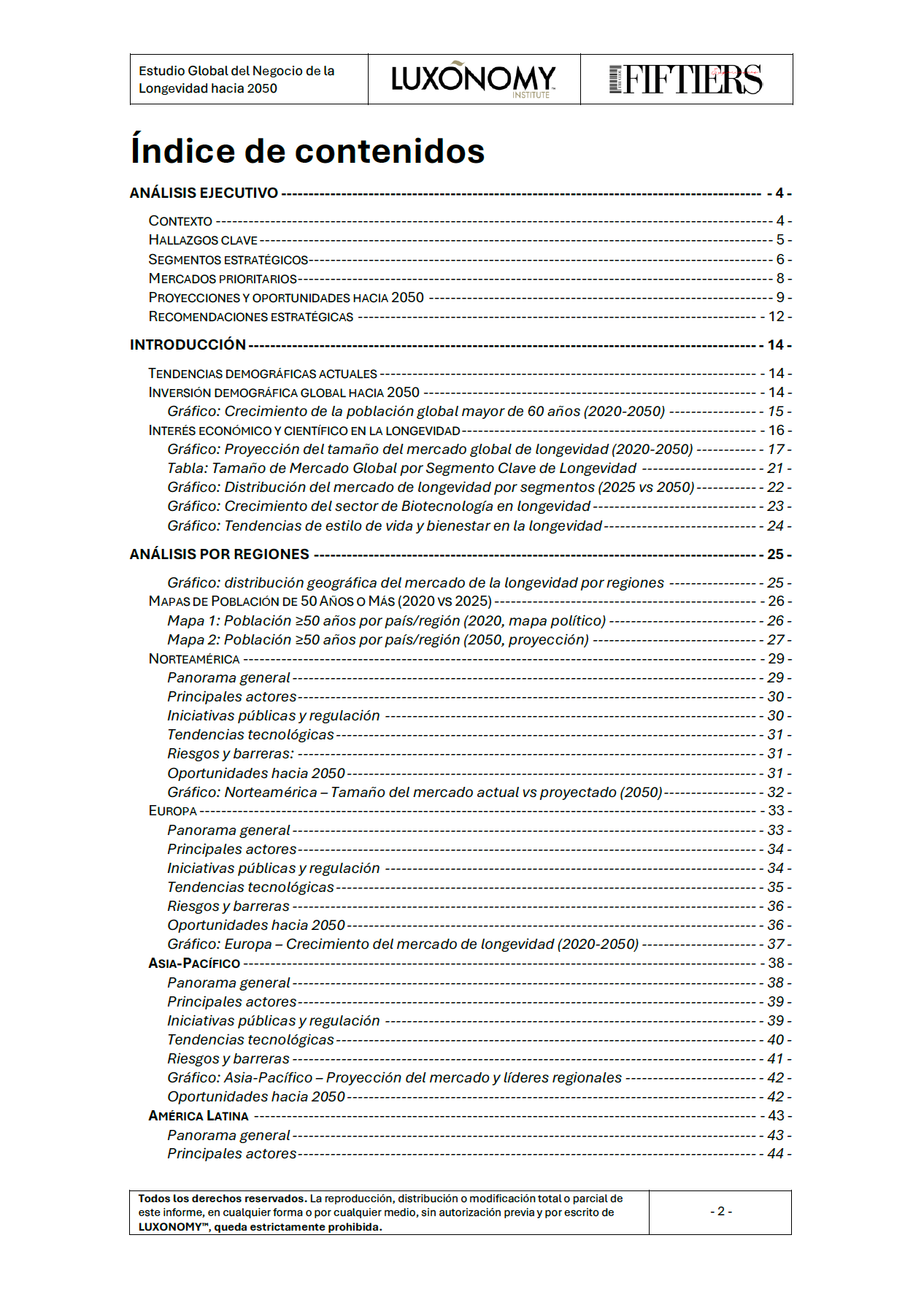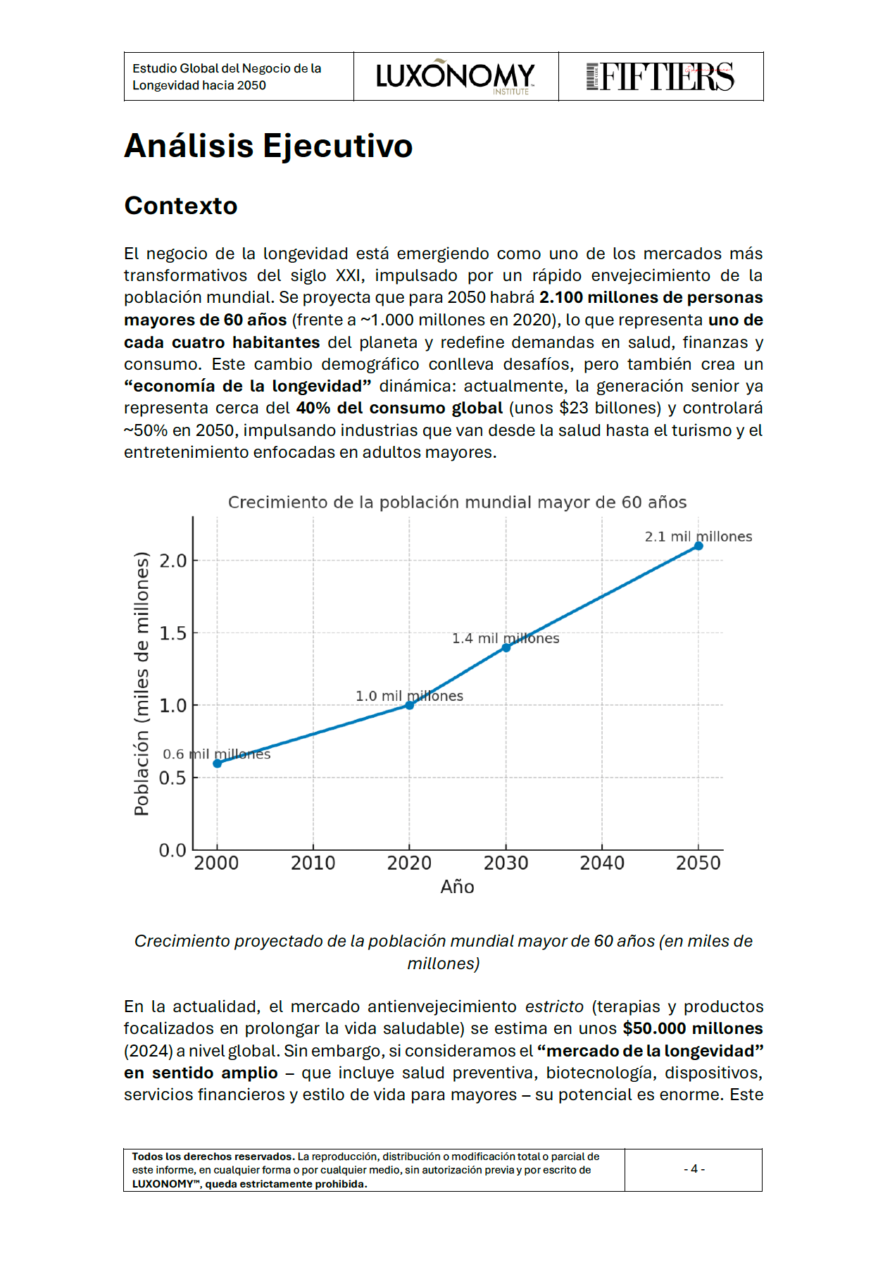 Considerado el primer análisis mundial de su tipo enfocado en este incipiente sector. Se trata de un informe pionero, elaborado entre enero y mayo de 2025, que ofrece una visión integral —estratégica, económica, tecnológica y demográfica— del emergente mercado de la longevidad. Este lanzamiento marca un hito en un momento clave, dado el rápido envejecimiento de la población mundial y las enormes implicaciones socioeconómicas de una vida más larga.